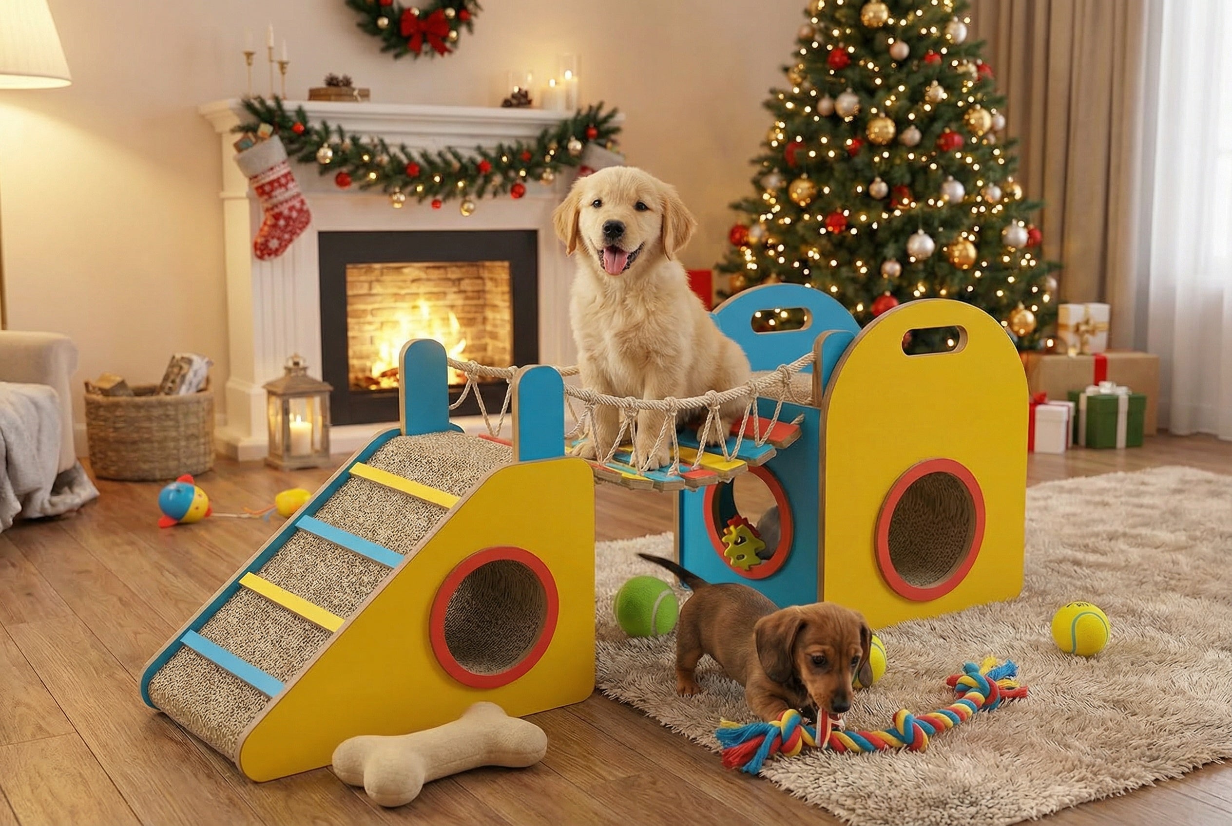 💖PupyToy® Wooden Pet House – Cozy Indoor Dog and Cat House with Sturdy Structure | Fun Playhouse with Tunnel, Ramp, and Scratching Surface | Ideal for Small to Medium Pets